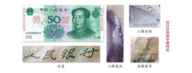 人民币正背票面中的国徽、行名、中文面额数字、光变油墨面额数字、盲文标记等均为雕刻凹印图案。上述图文具有独特的浮雕式的凹凸效果,可以通过手指检查其触感特征。