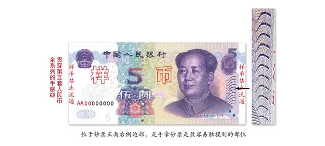 手感线是第五套人民币专门设置的公众级别手摸防伪特征,它也是利用雕刻凹印工艺制作的,相对票面其他雕刻凹印图案来说,其凹凸效果更加明显,可以利用手指的触感判定真假。